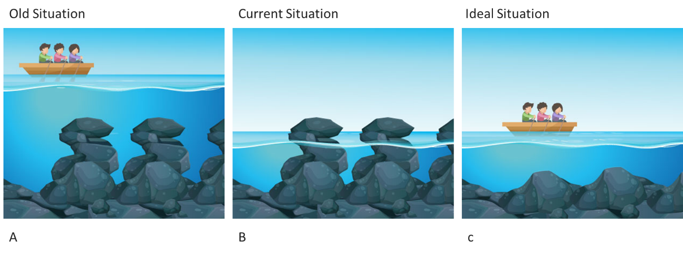 We used to enjoy high levels of water/ cash, our boats sailed smoothly without hitting the rocks in the bottom but once the water levels decrease the boat will be in trouble due to the rocks. That is exactly what happens in our factories and businesses. The water represents the inventory level and cash required to keep the business running and the rocks represent the supply chain and factories’ problems. The more water you need to keep business running, the longer your lead times for orders processing, when you have a high level of inventory you will never detect your factory problems or improve performance because you simply hide your problems (rocks). But remember that inventory is not for free - you pay for financing it, risk of obsolescence, aging, damage, the land and the facilities you need to store it. Once you have a lower level cash and lower inventory you can see problems like breakdowns, long changeovers, high rates of the defect, and also frequent downtime. We aim to decrease our inventory levels in order to eliminate the cost and detect our problems and solve them instead of living with them.